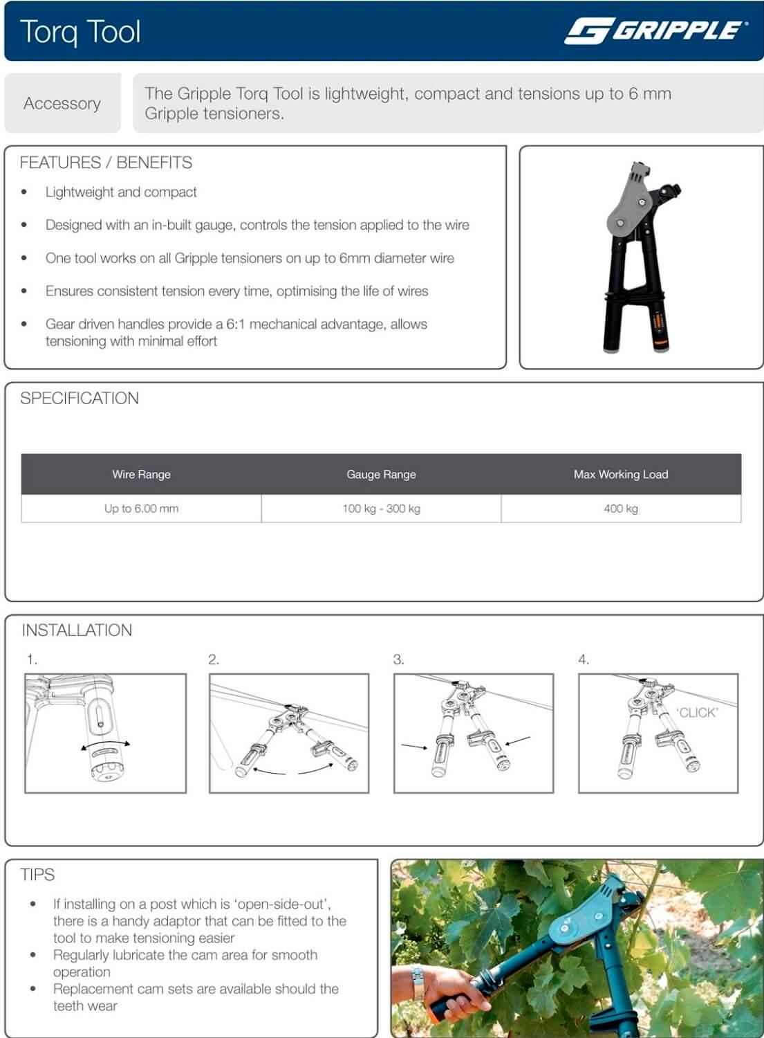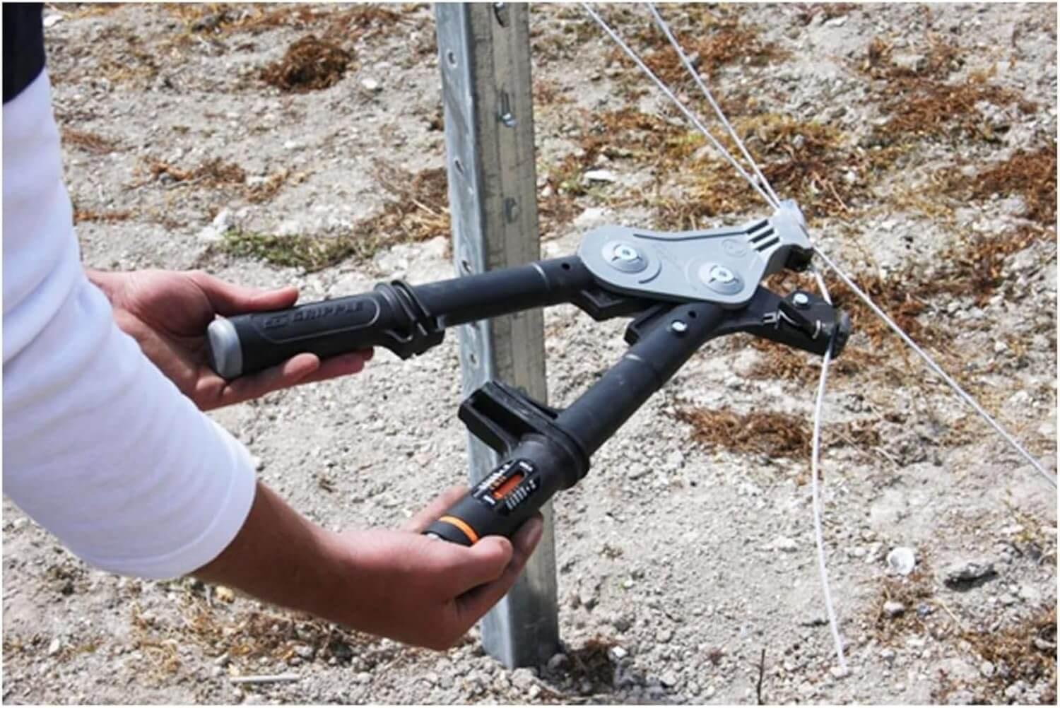 Allows tensioning of wire up to 400 kg with minimal effort due to the 6:1 gear drive mechanismWhether tensioning fence wire or trellis wire rope for anchoring systems, the Torq Tensioning Tool will work on all Gripple units up to a 6 mm diameterThe integral torque gauge controls the load applied to the wire, giving consistent tension every time and optimising the life of the wireMeasure from 100 kg to 300 kgEasy to use and lightweight for repetitive tensioning