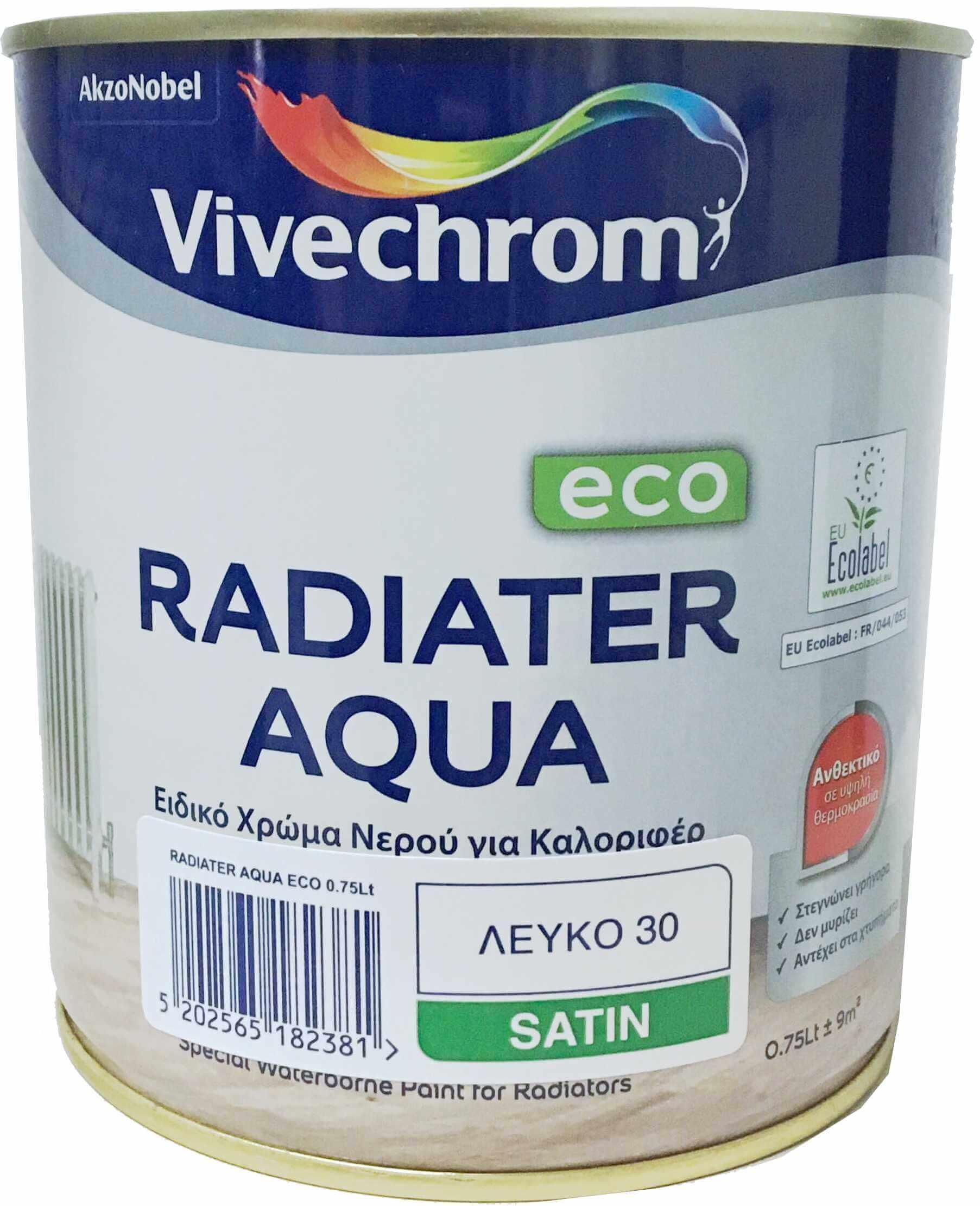 Το RADIATER AQUA ECO είναι ειδικό χρώμα νερού για καλοριφέρ, με κορυφαίες πρώτες ύλες νέας τεχνολογίας. Είναι πιστοποιημένο οικολογικό χρώμα από την Ευρωπαϊκή Ένωση. Παρουσιάζει μεγάλη αντοχή στη θερμοκρασία των καλοριφέρ και διατηρεί την γυαλάδα του και τη λευκότητά του για μεγάλο χρονικό διάστημα. Έχει εξαιρετική πρόσφυση και καλυπτικότητα και είναι κατάλληλο για την επαναβαφή παλαιών βερνικοχρωμάτων διαλύτου. Έχει μεγάλη ελαστικότητα και σκληρότητα και αντέχει στα χτυπήματα. Δουλεύεται εύκολα, απλώνει θαυμάσια, στεγνώνει γρήγορα και δεν μυρίζει.