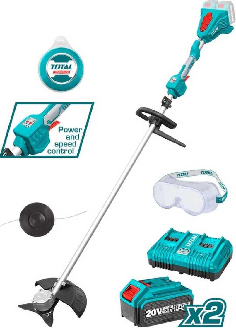 Brushless MotorVoltage: 2X20V = 40VNo load speed : 0-5500/min / 0-6500/minBlade cutting diameter: 255mmTrimmer cutting diameter: 330mmDiameter of knife: 2.0mm roundLength of mesh: 5mWith 2 Li-ion 4Ah batteriesWith Double port fast chargerWith knife head 1 pcWith 1pc 3T discWeight (without battery): 3KgPackaging: 1 TEM